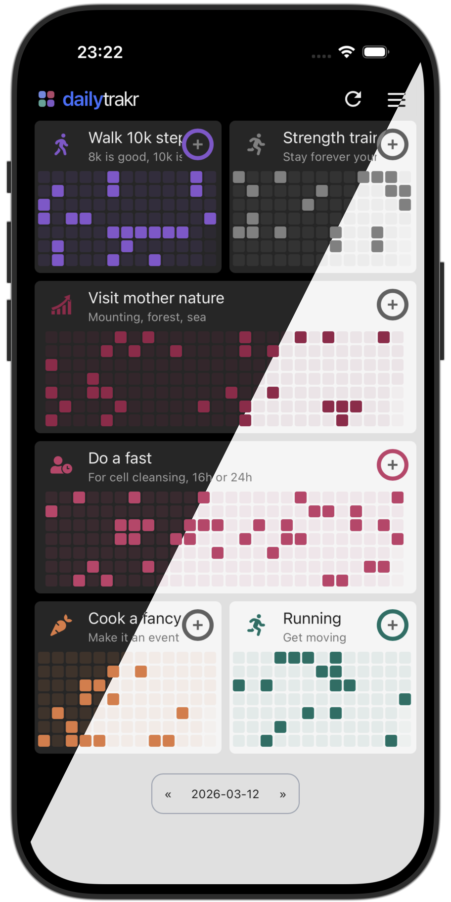 Users are free to lay out their habits as they want. By clicking the top part of a habit card, users can toggle between full and half width. When half width is used, 13 weeks are displayed.