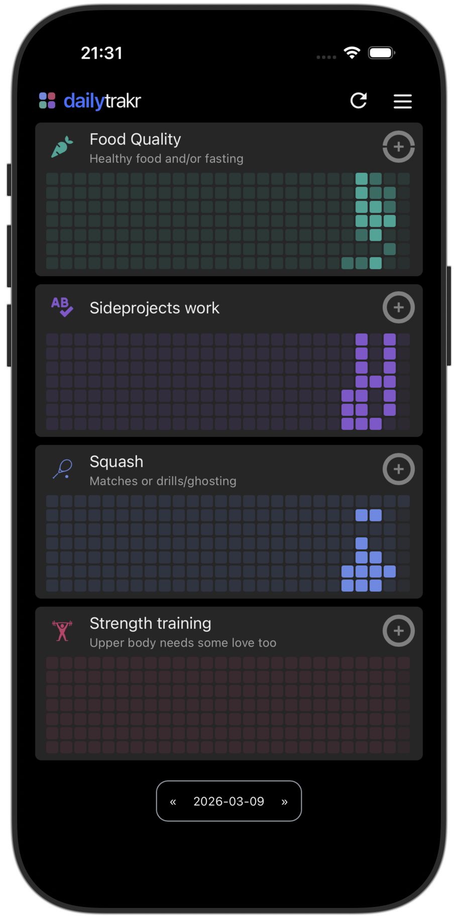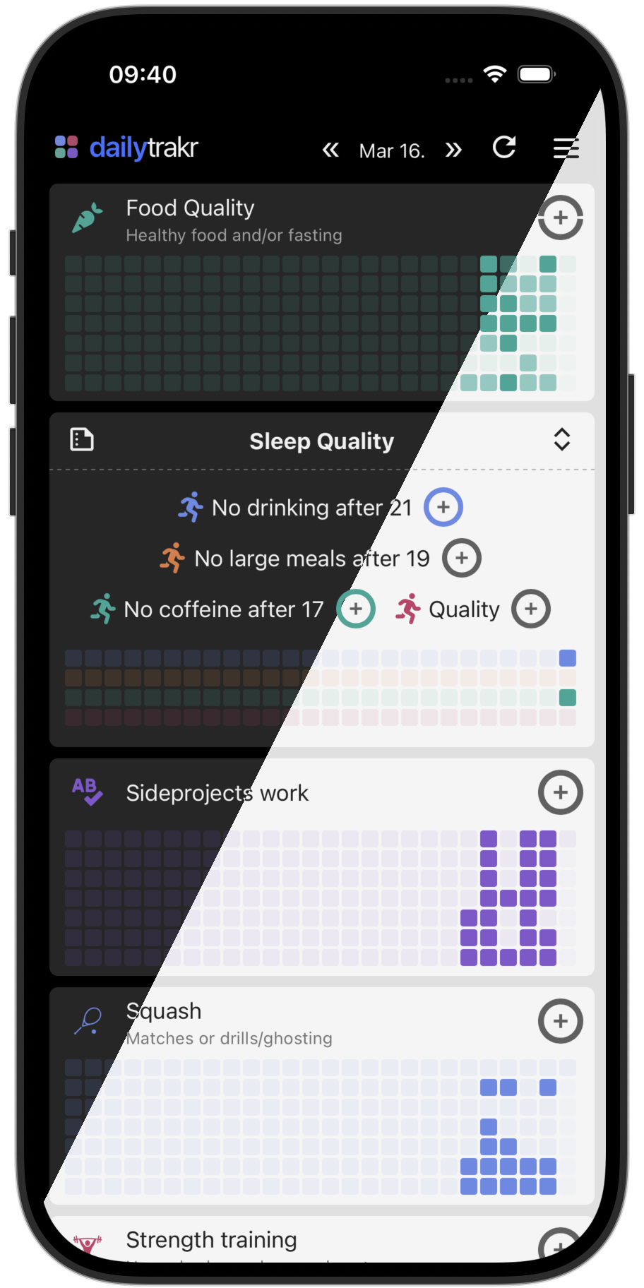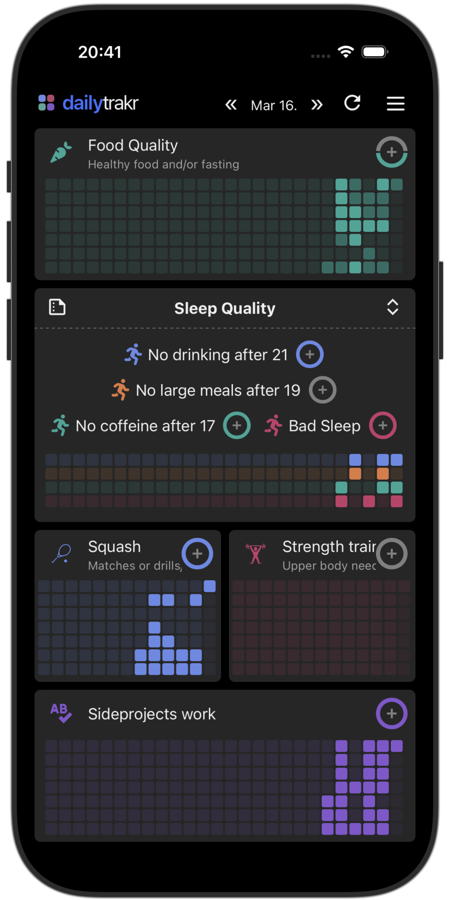 In the example to the left, there is a category "Sleep Quality" that contains four "habits". The first three are habits that contribute to sleep quality (avoding eating and drinking shortly before bed etc). The fourth habit allow you to log whether you had a "good quality" sleep. Over time, by tracking the right habits, you can actually discover what matters for your sleep quality.